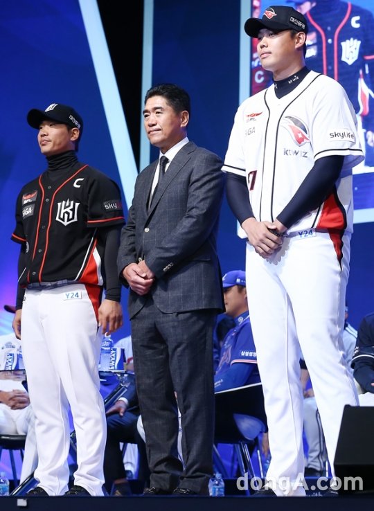 kt 조범현 감독, 박경수, 조무근 선수가 18일 오후 서울 용산구 블루스퀘어에서 열린 ‘2016 KBO 미디어데이’에 참석해 인사를 하고 있다.