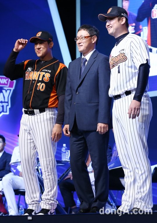 롯데 조원우 감독, 황재균, 손승락 선수가 18일 오후 서울 용산구 블루스퀘어에서 열린 ‘2016 KBO 미디어데이’에 참석해 인사를 하고 있다.