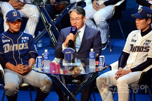 28일 서울 블루스퀘어 삼성카드홀에서 ‘2016 타이어뱅크 KBO리그’ 미디어데이가 열렸다. NC 김경문 감독이 개막을 앞두고 출사표를 밝히고 있다. 김민성 기자 marineboy@donga.com