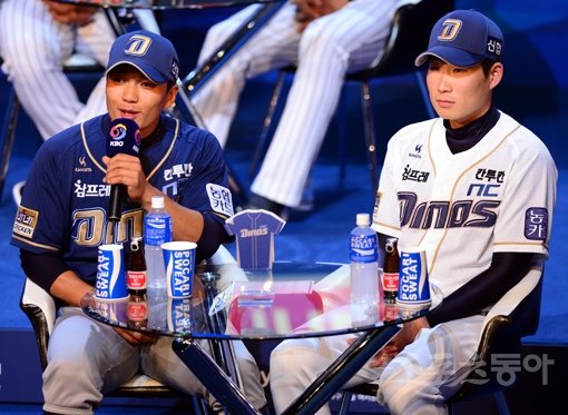 28일 서울 블루스퀘어 삼성카드홀에서 ‘2016 타이어뱅크 KBO리그’ 미디어데이가 열렸다. NC 이종욱(왼쪽)이 개막을 앞두고 출사표를 밝히고 있다. 김민성 기자 marineboy@donga.com