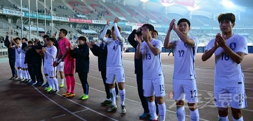 28일 경기도 고양종합운동장에서 열린 신태용 감독이 이끄는 U-23 올림픽 축구대표팀과 알제리 대표팀의 2차 평가전에서 대한민국이 3-0 완승을 거뒀다. 경기 후 대표팀 선수들이 붉은악마에게 인사를 하고 있다.