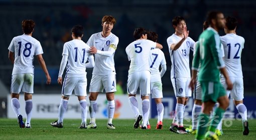 28일 경기도 고양종합운동장에서 열린 신태용 감독이 이끄는 U-23 올림픽 축구대표팀과 알제리 대표팀의 2차 평가전에서 대한민국이 3-0 완승을 거뒀다. 경기 후 선수들이 기쁨을 나누고 있다.