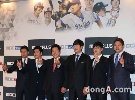 해설진 이종범, 백재홍, 허구연,정민철, 김선우, 양준혁(왼쪽부터)이 29일 오전 서울 광화문 포시즌스호텔에서 열린 MBC 스포츠 플러스2 개국 기자간담회에서 포토타임을 하고 있다.