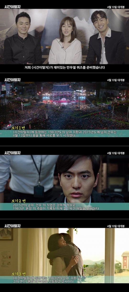 영상은 주연 배우 임수정, 조정석, 이진욱이 제시하는 퀴즈를 담고 있다. 영화와 관련된 세 가지 보기 중 거짓을 말하는 배우를 고르는 만우절 퀴즈는 세 배우의 친절한 설명과 더불어 ‘시간이탈자’의 주요 장면들을 미리 만나 볼 수 있어 눈길을 끈다. 영상에 나온 퀴즈 이벤트를 맞추면 푸짐한 경품을 받을 수 있는 기회가 주어진다.