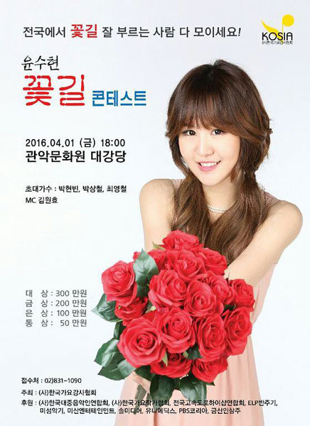 윤수현은 1일 오후 6시부터 서울 관악문화원에서 ‘꽃길’ 콘테스트를 개최했다. 총 23명의 참가자가 ‘꽃길’을 열창했고, 심사를 통해 순위가 정해졌다.