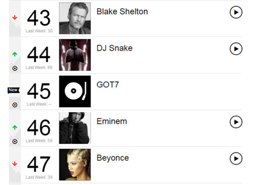 당시 7집을 냈던 싸이는 88위로 1주일간 머물렀다가 차트 밖으로 밀려났다. 갓세븐은 싸이보다 높은 45위이다. 갓세븐 바로 아래로 에미넴과 비욘세가 46∼47위에 자리하고 있다.