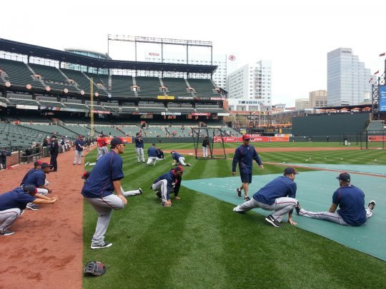 박병호가 개막전을 앞두고 스트레칭을 시작했다. 박병호의 시선은 배팅케이지에서 외롭게 방망이를 휘두르는 김현수에게 계속 향해 있었다. 볼티모어(메릴랜드 주)|김영준 기자