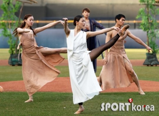 5일 오후 광주-기아챔피언스필드에서 열린 `2016 타이어뱅크 KBO 리그` 프로야구 KIA 타이거즈와 LG 트윈스의 경기에 앞서 발레리나 김주원과 발레리노 윤전일이 광주시립발레단과 공연을 펼치고 있다.