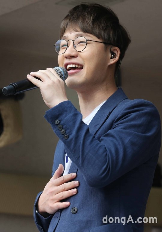 가수 홍대광이 6일 오전 서울 송파구 석촌호수에서 열린 MBC FM4U '굿모닝FM 전현무입니다' 특집 공개 방송에서 라이브 무대를 선보이고 있다.