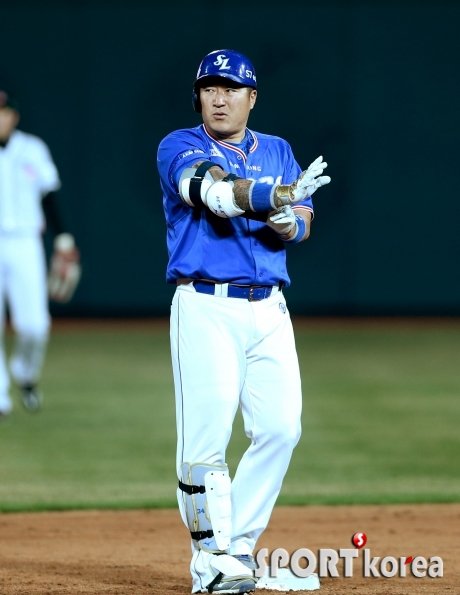 6일 오후 수원 kt 위즈파크에서 열린 `2016 프로야구` kt 위즈 대 삼성 라이온즈 경기 5회초 2사 1,3루에서 삼성 최형우가 2타점 2루타를 친 환호하고 있다.