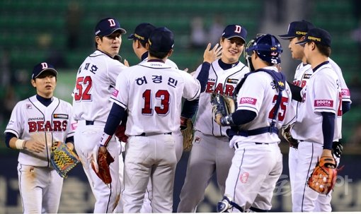 6일 서울 잠실야구장에서 '2016 타이어뱅크 KBO 리그' 두산베어스와 NC다이노스 경기가 열렸다. 2-0 승리를 거두며 2연승를 달린 두산 선수들이 경기 종료 후 하이파이브 하고 있다.