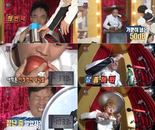 이어서 청각 테스트가 진행됐다. 50dB 이상 넘어가면 쟁반에 맞는 방식이었다. 캔 따기에 나선 박명수는 조심스럽게 캔을 땄지만 아몬드를 먹기도 전에 쟁반을 두 차례 얻어맞았다. 아몬드를 씹는 과정에서도 쟁반 세례를 피하지 못했고 한바탕 웃은 멤버들은 “형이 ‘마이리틀텔레비전’에서 이걸 했어야 한다”고 안타까워했다.