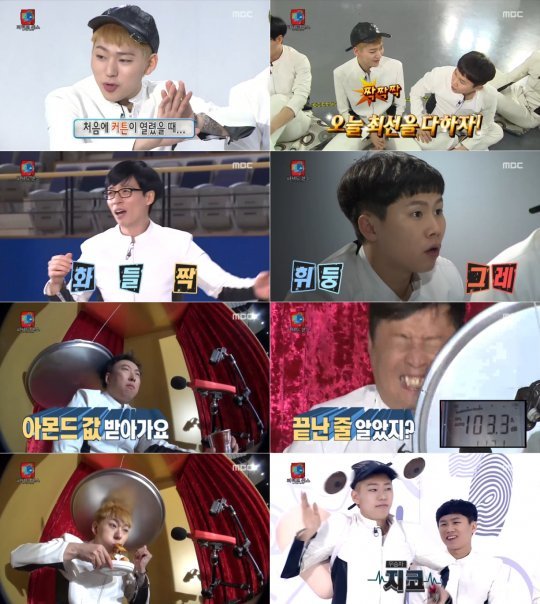 이어서 청각 테스트가 진행됐다. 준비된 음식을 먹다 50dB 이상 넘어가면 쟁반에 맞는 방식이었다. 박명수 정준하 지코는 각각 아몬드캔 사이다 총각김치를 먹다 쟁반 세례를 맞았다. 특히 정준하는 탄산 탓에 새어 나오는 트림을 참지 못했고 이 모습을 본 멤버들 또한 웃음을 참지 못했다. 이후 미각 후각 촉각 테스트가 이어졌고 지코가 멤버들을 제치고 최종 승리했다.