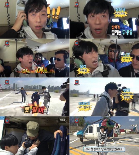 안대로 눈을 가리고 헬기 세트에 탑승한 유재석은 “이번에는 진짜 같다. 알고 타도 헬기라고 생각할 수밖에 없다. 진짜 멀미난다. 이게 기중기로 가능한 것이냐”고 감탄을 아끼지 않았다. 이윽고 안대를 벗은 유재석. 얼떨떨해하던 그는 이내 사색이 돼버렸다. 그가 탄 세트는 가짜가 아니라 실제로 4000m 상공에서 비행 중인 헬기 안이었기 때문이다.