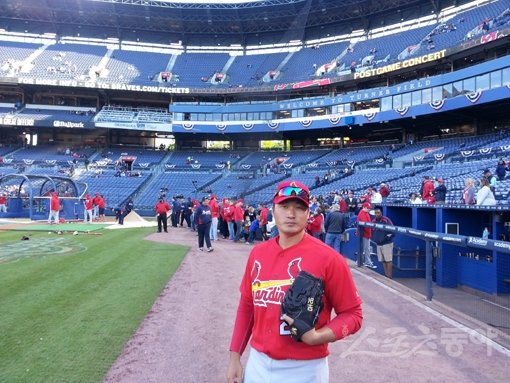 세인트루이스 오승환이 10일(한국시간) 미국 조지아주 애틀랜타의 터너필드에서 포즈를 취하고 있다. 오승환은 메이저리그 데뷔전을 포함해 3경기 동안 2.2이닝 무실점 6삼진으로 호투하고 있다. 애틀랜타(미 조지아주)|김영준 기자 gatzby@donga.com