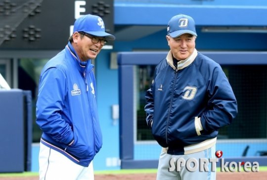 12일 오후 대구 라이온즈파크에서 열리는 `2016 프로야구` 삼성 라이온즈 대 NC 다이노스 경기에 앞서 삼성 류중일 감독과 NC 김경문 감독이 그라운드에서 만나 얘기를 나누고 있다.