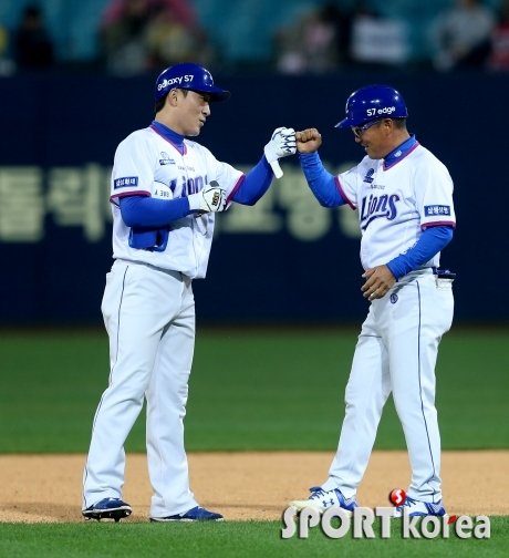 13일 오후 대구 라이온즈파크에서 열린 `2016 프로야구` 삼성 라이온즈 대 NC 다이노스 경기 5회말 1사에서 삼성 배영섭이 우전 2루타를 친 후 김평호 1루코치의 환영을 받고 있다.