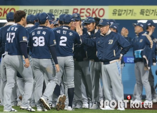 13일 오후 대구 라이온즈파크에서 `2016 프로야구` 삼성 라이온즈 대 NC 다이노스 경기가 열려 NC 삼성에 7대 2로 승리했다. 경기종료 후 NC 선수들이 승리의 기쁨을 나누고 있다.