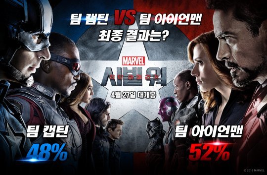 영화 ‘캡틴 아메리카: 시빌 워’가 대국민 투표 결과를 공개하며 네티즌들이 선택한 최종 승리팀과, 팬들의 마음을 사로잡은 최고의 히어로를 정리했다.