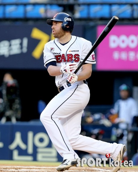 15일 오후 서울 잠실야구장에서 열린 `2016 프로야구` 두산 베어스 대 삼성 라이온즈 경기 1회말 1사 1,3루에서 두산 에반스가 선제타를 치고 있다.