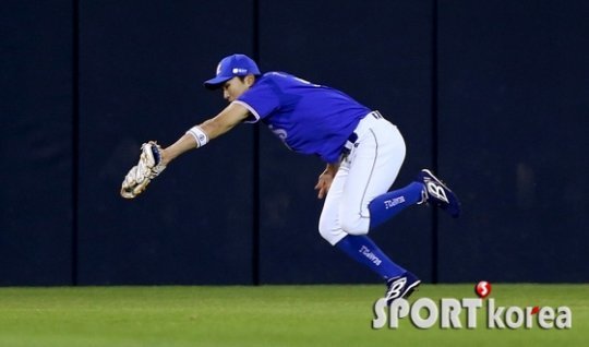 15일 오후 서울 잠실야구장에서 열린 `2016 프로야구` 두산 베어스 대 삼성 라이온즈 경기 6회말 1사 1루에서 두산 민병헌의 타구를 삼성 우익수 박해민이 잡고 있다.
