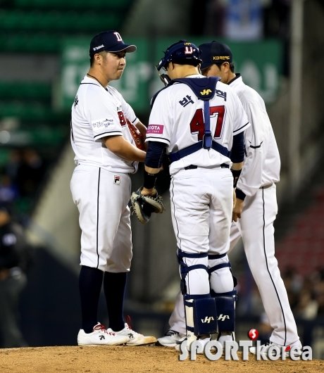 15일 오후 서울 잠실야구장에서 열린 `2016 프로야구` 두산 베어스 대 삼성 라이온즈 경기 7회초 2사 만루에서 두산 선발 유희관이 강판되고 있다.