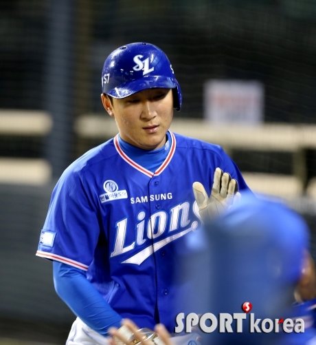 15일 오후 서울 잠실야구장에서 열린 `2016 프로야구` 두산 베어스 대 삼성 라이온즈 경기 7회초 2사 1,2루에서 삼성 최선호의 1타점 적시타로 홈을 밟은 2루주자 배영섭이 덕아웃 동료들의 환영을 받고 있다.