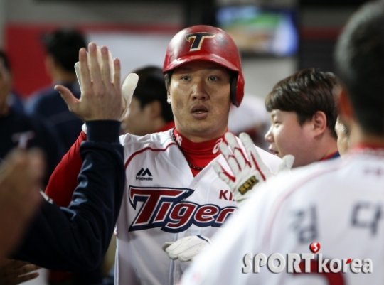 15일 오후 광주-기아챔피언스필드에서 열린 `2016 타이어뱅크 KBO 리그` 프로야구 KIA 타이거즈와 넥센 히어로즈의 경기 KIA 7회말 1사 3루에서 4번 필의 적시타 때 통산 50개 3루타를 치고 진루한 3루주자 김주찬이 득점을 올리고 덕아웃에서 동료선수들과 하이파이브를 나누고 있다.