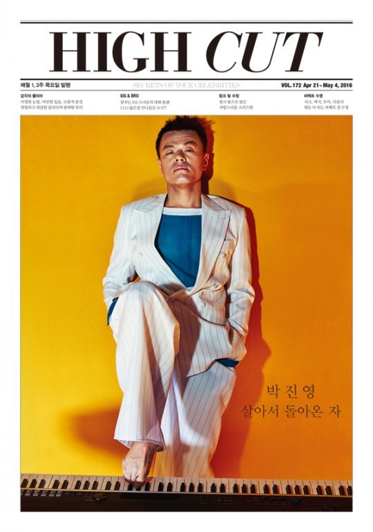 박진영은 스타 스타일 매거진 하이컷 화보를 통해 카리스마 있으면서도 위트 있는 모습으로 살아있는 ‘레전드’의 위용을 보여줬다. 22년의 세월을 톱클래스 딴따라로 살아올 수 있었던 박진영의 매력을 파헤치는 게 이번 화보의 컨셉트. 발로 건반을 두드리고, 농구에 열광하고, 무대를 향한 열정이 불타오르고, 수없이 많은 상 앞에서 초연한 모습 등을 코믹하게 담았다.