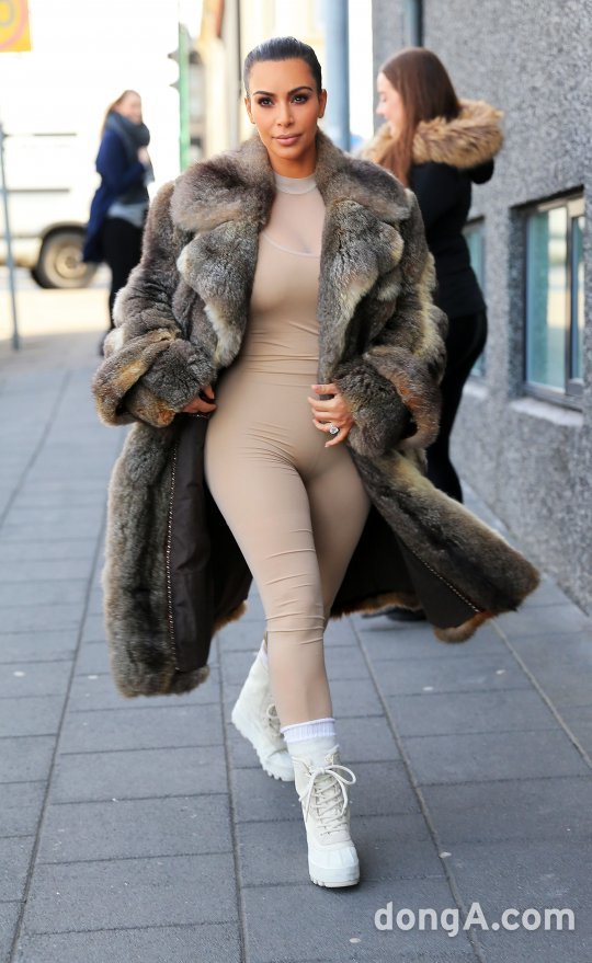 킴 카다시안은 남편 칸예 웨스트가 런칭한 의류 브랜드 ‘이지(Yeezy)’의 딱 달라붙는 스킨톤 바디수트 위에 퍼코트를 걸치고 모습을 드러냈다.