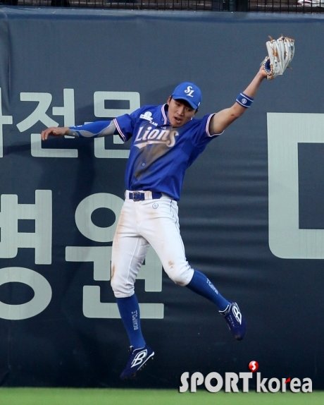 19일 오후 광주-기아챔피언스필드에서 열린 `2016 타이어뱅크 KBO 리그` 프로야구 KIA 타이거즈와 삼성 라이온즈의 경기에서 삼성 중견수 박해민이 2회말 무사 2루에서 KIA 5번 이범호의 타구를 호수비로 잡아내고 있다.