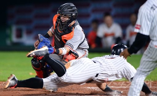 19일 부산 사직야구장에서 '2016 타이어뱅크 KBO리그' 롯데 자이언츠와 한화 이글스의 경기가 열렸다. 9회말 1사 3루에서 롯데 정훈이 중견수 플라이 아웃 때 홈으로 쇄도한 강민호가 세이프 되고 있다.