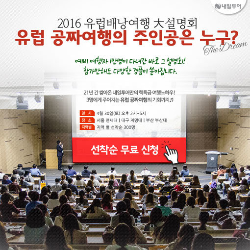 내일투어는 30일 오후 2시부터 서울 대구 부산에서 유럽 배낭여행 설명회(사진)를 동시 진행한다. 연세대학교, 계명대학교, 부산대학교에서 각각 진행하고 지역별 300명씩 선착순. 내일투어 홈페이지에서 무료로 신청하면 된다. 참가자에게는 추첨을 통해 영국항공 유럽왕복항공권(지역별 1명), 유레일패스 1등석(지역별 1명), 알프스 티틀리스 등정권(지역별 4명씩), 가이드북 ´유럽으로 가출하기‘(지역별 5명) 등의 경품을 제공한다.