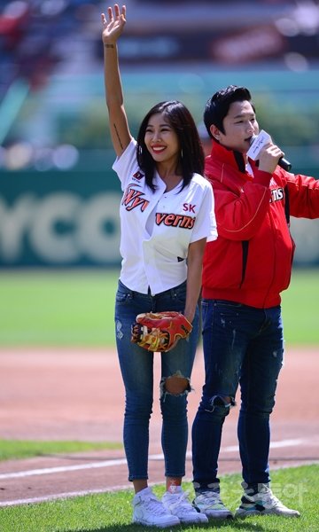 24일 인천 SK행복드림구장에서 '2016 타이어뱅크 KBO리그' SK 와이번스와 NC 다이노스의 경기가 열렸다. 경기 전 가수 제시가 시구를 하기 전 관중석을 향해 인사를 하고 있다.