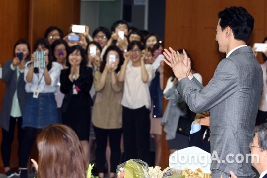 배우 조인성이 26일 오전 서울 서울지방국세청에서 열린 2016 국세청 홍보대사 위촉식에 참석해 기립박수를 치고 있다.