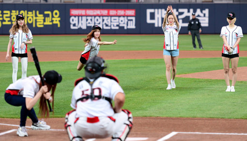 26일 수원 kt위즈파크에서 '2016 타이어뱅크 KBO리그' kt 위즈와 롯데 자이언츠의 경기가 열렸다. 프로듀서 101 출신의 걸그룹 불독이 시구와 시타를 펼치고 있다.