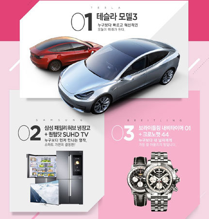 행사 기간 동안 매주 3명씩 총 9명에게 경품을 증정한다. 1주차(4/25∼5/4)인 ‘상상도 못한 소원’ 행사 기간에는 사전예약 돌풍을 일으키고 있는 미국 전기차 브랜드 ‘테슬라’의 2018년형 전기차 ‘모델3’, 삼성전자의 풍부한 색 재현력을 갖추고 최신 퀀텀닷 기술이 적용된 ‘SUHD TV’, 세계 최초로 냉장고에 IoT 기능을 탑재한 삼성전자의 ‘패밀리 허브’ 냉장고, 스위스 명품 브랜드 ‘브라이틀링’의 남성시계 2종을 총 3명에게 증정한다.