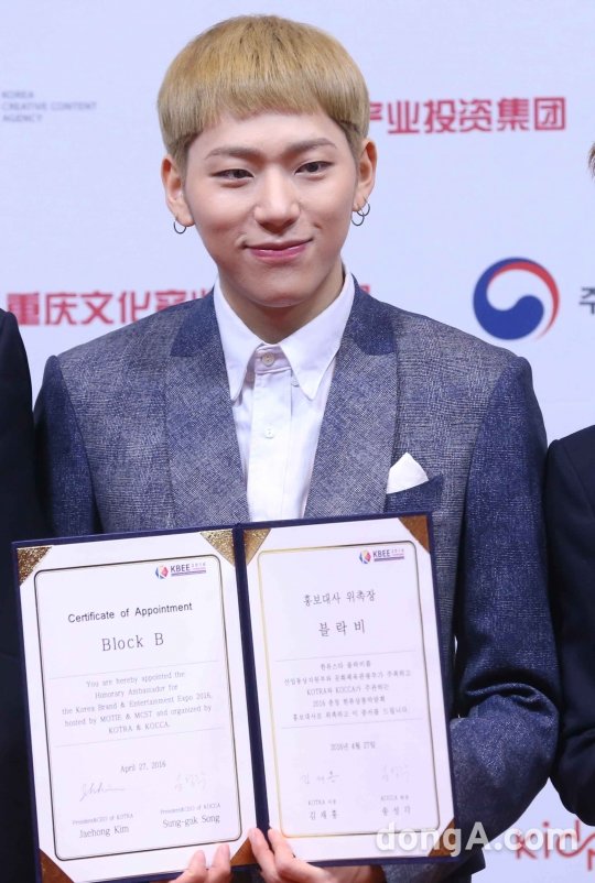 그룹 블락비의 지코가 27일 오전 서울 서초구 KOTRA 본사에서 열린 '2016 충칭 한류상품박람회 홍보대사 기자회견에서 위촉패를 받고 있다.