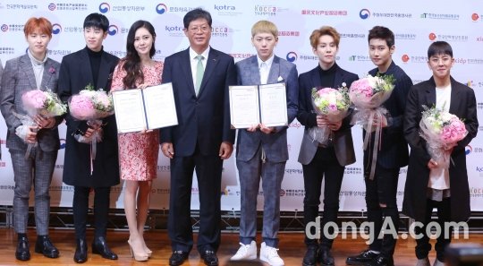 27일 오전 서울 서초구 KOTRA 본사에서 열린 '2016 충칭 한류상품박람회 홍보대사 위촉식에서 관계자들이 포토타임을 하고 있다.