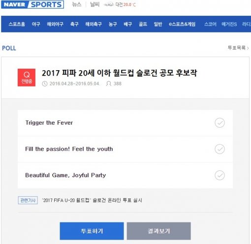 2017피파20세월드컵조직위원회(이하 조직위원회)는 내년 5월 우리나라에서 개막하는 ‘2017 FIFA U-20 월드컵’ 슬로건의 선정을 위해 28일부터 5월 4일까지 일주일간 네이버 여론조사를 실시한다.