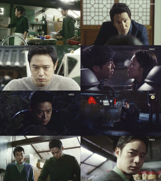 배우 천정명과 조재현이 등 돌린 채 서로를 압박하고 있다.