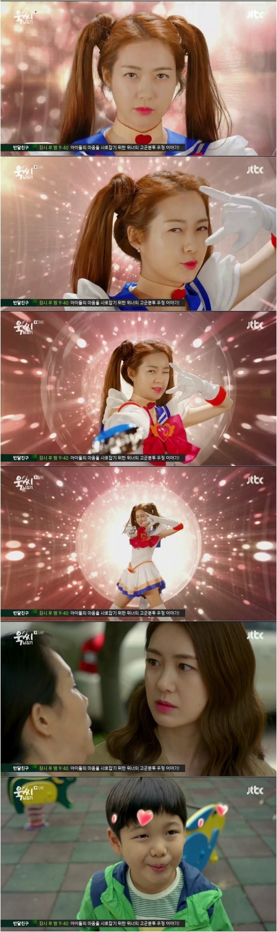 우주는 자신을 도와준 옥다정을 하트를 띄운 눈으로 바라보며 정의의 사도 세일러문을 떠올렸다. 남우주의 상상은 화면에 그대로 옮겨졌다. 옥다정은 양 갈래 머리에 세일러복을 입은 미소녀 전사 세일러 문으로 변신해 “‘우주를 괴롭히는 악당들아. 정의의 이름으로 널 용서하지 않겠다”고 말하며 요술봉을 휘둘러 폭소를 자아냈다.