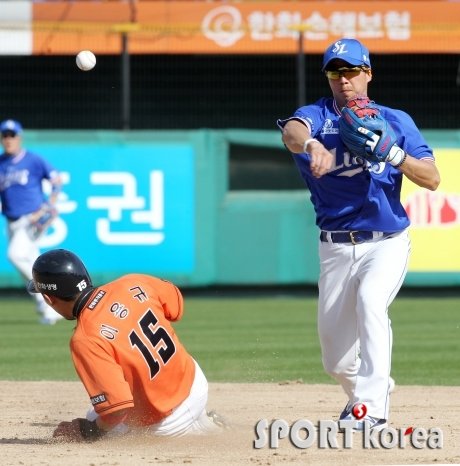 1일 오후 대전 한화생명 이글스파크에서 열린 `2016 프로야구` 한화 이글스 대 삼성 라이온즈 경기 5회말 1사 1루에서 한화 김경언의 내야땅볼을 토스받은 삼성 2루수 백상원이 1루주자 이용규를 포스아웃 시킨 후 1루에 송구해 더블플레이를 만들고 있다.