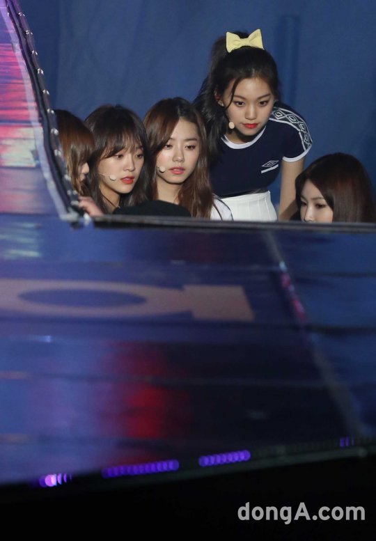 걸그룹 아이오아이(I.O.I)가 5일 오전 서울 장충체육관에서 열린 첫번째 미니 앨범 'Chryslis' 발표 쇼케이스에 참석해 무대 아래서 준비를 하고 있다.