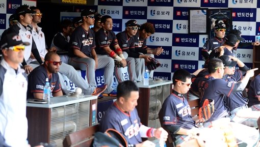 8일 수원 kt위즈파크에서 '2016 타이어뱅크 KBO리그' kt 위즈와 한화 이글스의 경기가 열렸다. 한화 선수들이 더그아웃에서 경기를 지켜보고 있다.