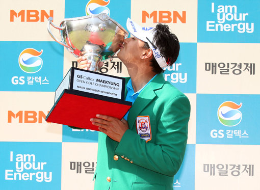8일 경기도 성남 남서울 골프장에서 열린 GS칼텍스매경오픈 최종라운드에서 연장 접전 끝에 이수민을 꺾고 통산 5승째를 거둔 박상현이 우승 트로피에 입을 맞추고 있다. 사진제공|KPGA