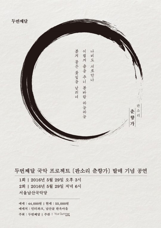 5월 29일 서울 남산국악당에서 열릴 두번째달 단독공연에서는 두번째달 국악프로젝트 '판소리 춘향가'의 수록곡을 젊은 두 소리꾼 고영열, 김준수의 목소리로 들을 수있다.