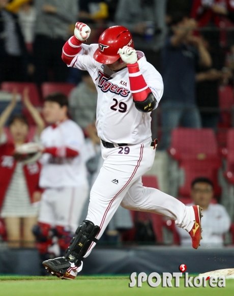 12일 오후 광주-기아 챔피언스 필드에서 열린 `2016 타이어뱅크 KBO 리그` 프로야구 KIA 타이거즈와 kt 위즈의 경기에서 KIA 4번타자 나지완이 7회말 1사 후 좌월 솔로홈런을 치고 베이스를 돌며 세레모니를 펼치고 있다.