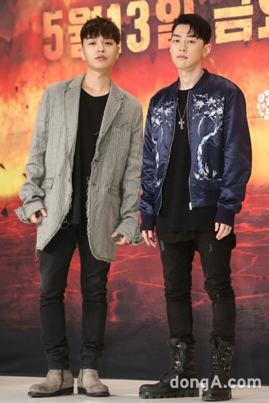 가수 사이먼도미닉(왼쪽), 그레이가 13일 오전 서울 영등포구 영등포 타임스퀘어에서 열린 케이블채널 Mnet 서바이벌 프로그램 ‘쇼미더머니5’ 제작발표회에 참석해 포토타임을 하고 있다.