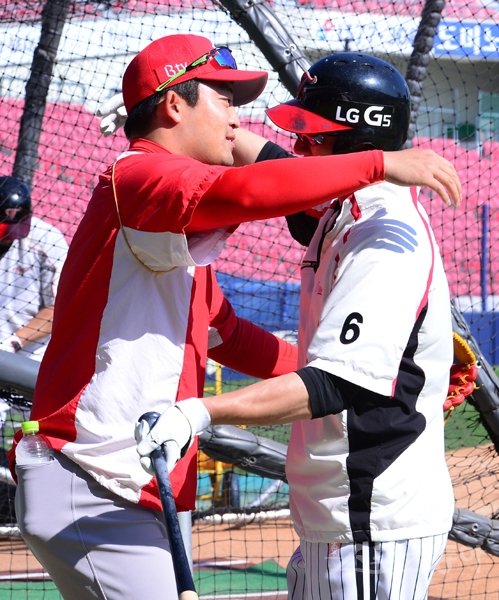 13일 서울 잠실야구장에서 '2016 타이어뱅크 KBO리그' LG 트윈스와 SK 와이번스의 경기가 열린다. 경기 전 SK 정의윤이 LG 손주인(오른쪽)과 포옹을 하고 있다.